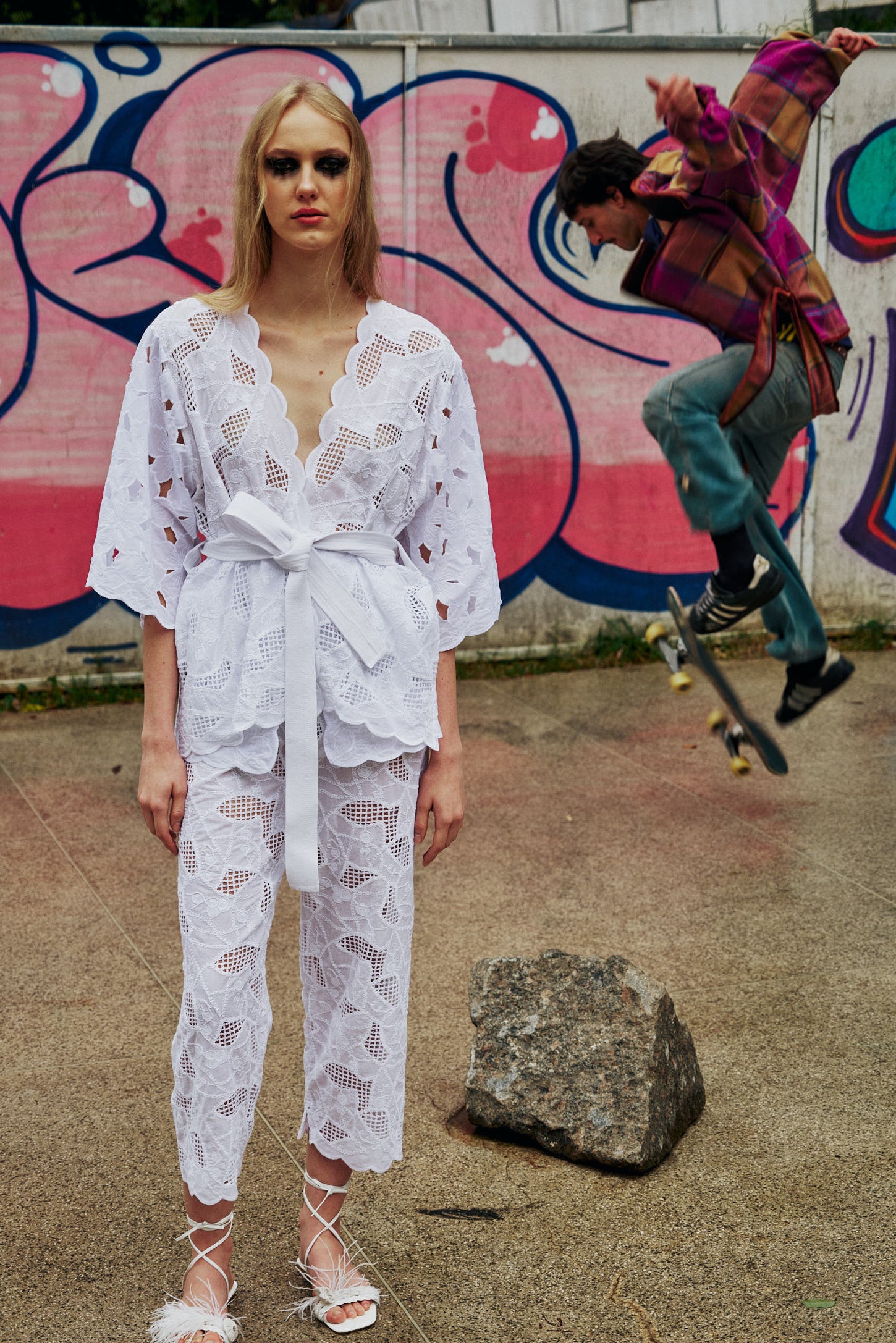 Calça em renda de veludo. Peplum aplicado. Shape soltinho com fechamento por zíper.